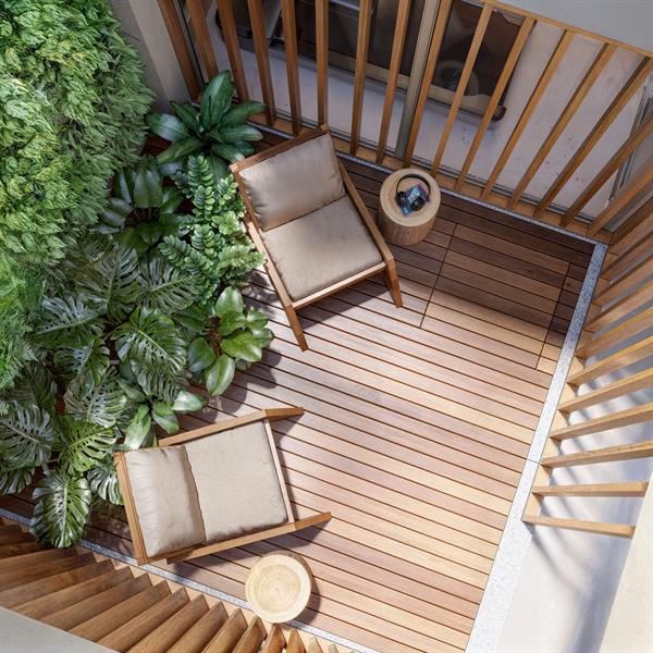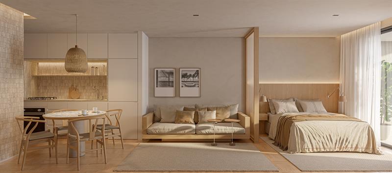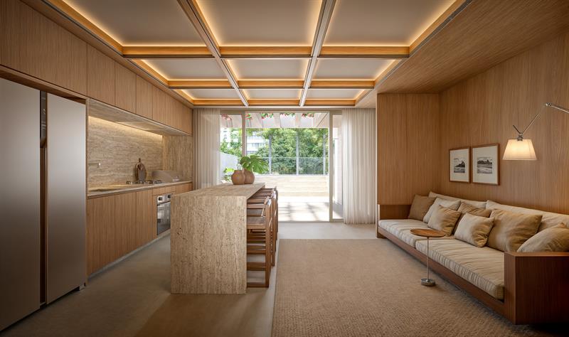 Os apartamentos Double Garden do Ar Ipanema têm 66 m² e contam com área externa privativa, ideal para momentos de lazer e descanso. Os ambientes são integrados e bem iluminados, oferecendo amplitude e ventilação natural, com um design que une elegância e conforto em cada detalhe.