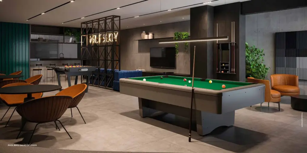 Salão de jogos, coworking e churrasqueira