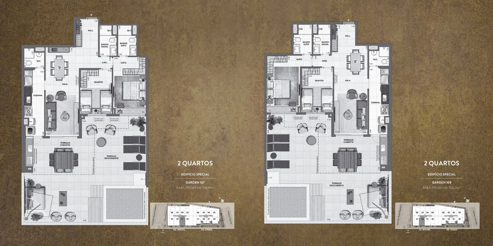 O projeto apresenta apartamentos de 2 e 3 quartos com suíte, com metragens amplas e opções que vão de gardens com generosos quintais a coberturas lineares, raridade na região. Ideal para quem busca mais espaço, conforto e exclusividade.